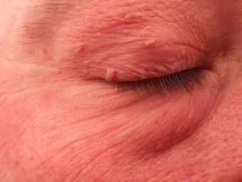 It appears around the eyelids and the size can vary from a very small to one inch.